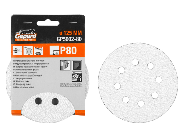 Шлифлист 125мм круг Р40 д/краски 8 отв. 5шт. GEPARD (GP5002-40) (круг абразивный шлифовальный перфорированный)